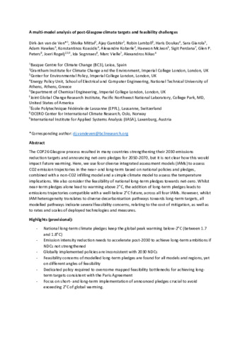 A multimodel analysis of post-Glasgow climate targets and feasibility challenges.