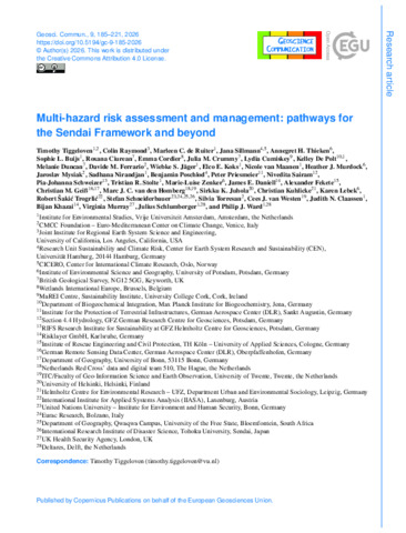 Tiggeloven, T., Raymond, C., de Ruiter, M.C., Sillmann, J., Thieken, A.H., Buijs, S.L., Ciurean, R., Cordier, E., Crummy, J.M., Cumiskey, L., De Polt, K., Duncan, M., Ferrario, D.M., Jäger, W.S., Koks, E.E., van Maanen, N., Murdock, H.J., Mysiak, J., Nirandjan, S., Poschlod, B., et al. (2026). Reflections and Future Directions for Multi-Hazard Risk in the Context of the Sendai Framework and Discussions Beyond. Geoscience Communication 10.5194/gc-9-185-2026.