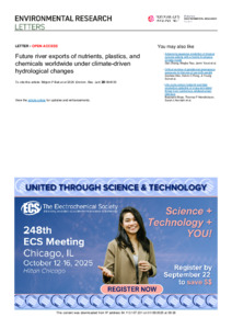 Bak, M.P., Micella, I., Jones, E.R., Kumar, R., Nkwasa, A. ORCID: https://orcid.org/0000-0002-8685-8854, Tang, T., van Vliet, M.T.H., Wang, M., & Strokal, M. (2025). Future river exports of nutrients, plastics and chemicals worldwide under climate-driven hydrological changes. Environmental Research Letters 20 (9) e094033. 10.1088/1748-9326/adf860.