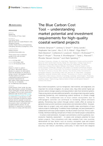 Simpson, S., Smart, L., Landis, E., vanLaere, S., Kibria, A., Albot, O., Beeston, M., Lovelock, C., Mcdonald, R., Moyer, R., Worthington, T., Maxwell, T., Stewart-Sinclair, P., & Spalding, M. (2025). The Blue Carbon Cost Tool - understanding market potential and investment requirements for high-quality coastal wetland projects. Frontiers in Marine Science 12 e1622255. 10.3389/fmars.2025.1622255. (In Press)