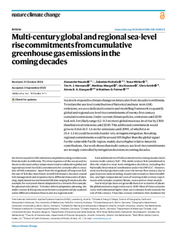 Multi-century global and regional sea-level rise commitments from cumulative greenhouse gas emissions in the coming decades.