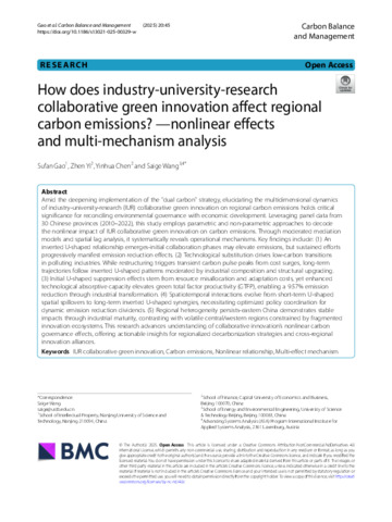 Gao, S., Yi, Z., Chen, Y., & Wang, S. (2025). How does industry-university-research collaborative green innovation affect regional carbon emissions? —nonlinear effects and multi-mechanism analysis. Carbon Balance and Management 20 (1) e45. 10.1186/s13021-025-00329-w.