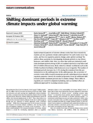 Zantout, K., Balkovič, J. ORCID: https://orcid.org/0000-0003-2955-4931, Billing, M., Folberth, C. ORCID: https://orcid.org/0000-0002-6738-5238, Gosling, S.N., Hank, T., Hantson, S., Iizumi, T., Ito, A., Jägermeyr, J., Jain, A.K., Khabarov, N. ORCID: https://orcid.org/0000-0001-5372-4668, Kou-Giesbrecht, S., Li, F., Li, M., Lin, T.-S., Liu, W., Müller, C., Okada, M., Ostberg, S., et al. (2025). Shifting dominant periods in extreme climate impacts under global warming. Nature Communications 16 (1) e9746. 10.1038/s41467-025-65600-7.