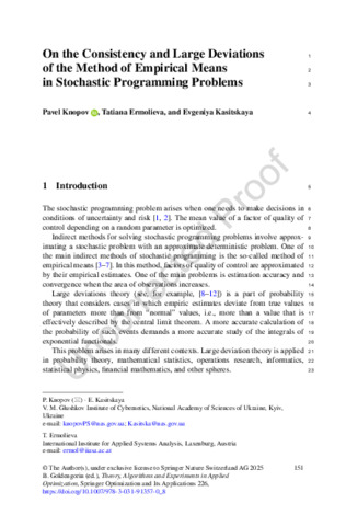 Knopov, P., Ermolieva, T., & Kasitskaya, E. (2025). On the Consistency and Large Deviations of the Method of Empirical Means in Stochastic Programming Problems. In: Theory, Algorithms, and Experiments in Applied Optimization: In Honor of the 70th Birthday of Panos Pardalos. Eds. Goldengorin, B., pp. 151-170 Cham, Switzerland: Springer. ISBN 978-3-031-91356-3 10.1007/978-3-031-91357-0_8.