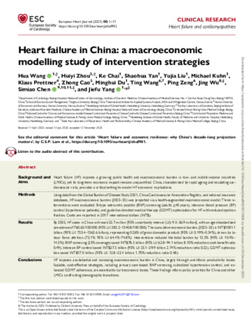 Wang, H., Zhou, H., Chai, K., Yan, S., Liu, Y., Kuhn, M., Prettner, K., Cao, Z., Du, M., Wang, T., Zeng, P., Wu, J., Chen, S., & Yang, J. (2025). Heart failure in China: a macroeconomic modelling study of intervention strategies. European Heart Journal ehaf992. 10.1093/eurheartj/ehaf992.