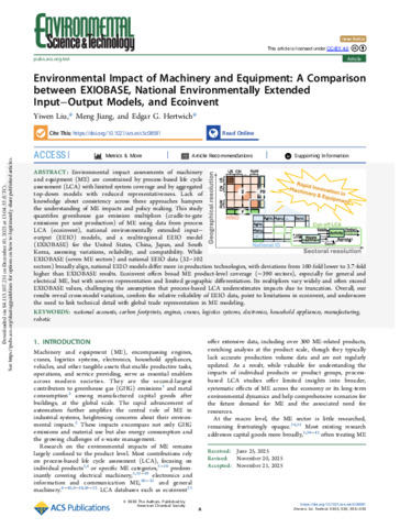 Liu, Y., Jiang, M., & Hertwich, E. (2025). Environmental Impact of Machinery and Equipment: A Comparison between EXIOBASE, National Environmentally Extended Input–Output Models, and Ecoinvent. Environmental Science & Technology 10.1021/acs.est.5c08581. (In Press)