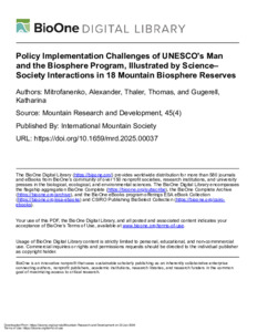 Mitrofanenko, A., Thaler, T. ORCID: https://orcid.org/0000-0003-3869-3722, & Gugerell, K. (2025). Policy Implementation Challenges of UNESCO's Man and the Biosphere Program, Illustrated by Science–Society Interactions in 18 Mountain Biosphere Reserves. Mountain Research and Development 45 (4) 20-30. 10.1659/mrd.2025.00037.