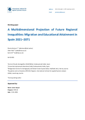 Damoun, O., Yildiz, D. ORCID: https://orcid.org/0000-0001-6192-0634, & K.C., S. (2026). A Multidimensional Projection of Future Regional Inequalities: Migration and Educational Attainment in Spain 2021–2071. IIASA Working Paper. Laxenburg, Austria: WP-26-001