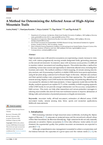High-mountain areas with sensitive ecosystems are experiencing a steady increase in visitation, with visitors progressively moving outside designated trails, generating pressures on the natural environment. In extensive areas with numerous access points, it is difficult to monitor visitors’ movement and resulting impacts. This article describes a method for combining various data sources and approaches to determine affected areas, including their locations and extent. The method combines (1) field-mapping, (2) remote-sensing data display analysis, and (3) processing of publicly available GNSS tracks from sports applications, using 46 test plots along a selected trail to Mount Triglav in Slovenia. Affected-area surfaces and their spatial overlap were compared across the three approaches. The usefulness of remote-sensing displays and GNSS tracks for determining and predicting affected areas was assessed by reference to field measurements. A linear regression model showed that the display-analysis approach can explain 52.7% of the variability in field-mapping approach, while GNSS tracks do not provide enough information nor the accuracy comparable to field surveys. This study can help other researchers and nature-protection managers in selecting most suitable data derived from non-traditional sources to improve delineation of hiking trails and estimation of potential pressures on fragile environments.
