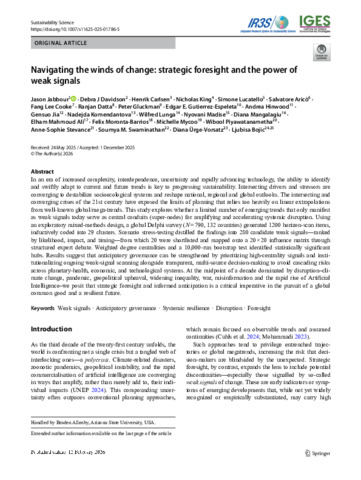 In an era of increased complexity, interdependence, uncertainty and rapidly advancing technology, the ability to identify and swiftly adapt to current and future trends is key to progressing sustainability. Intersecting drivers and stressors are converging to destabilize socioecological systems and reshape national, regional and global outlooks. The intersecting and converging crises of the 21st century have exposed the limits of planning that relies too heavily on linear extrapolations from well-known global/mega-trends. This study explores whether a limited number of emerging trends that only manifest as weak signals today serve as central conduits (super-nodes) for amplifying and accelerating systemic disruption. Using an exploratory mixed-methods design, a global Delphi survey (N = 790, 132 countries) generated 1200 horizon-scan items, inductively coded into 29 clusters. Scenario stress-testing distilled the findings into 280 candidate weak signals—ranked by likelihood, impact, and timing—from which 20 were shortlisted and mapped onto a 20 × 20 influence matrix through structured expert debate. Weighted degree centralities and a 10,000-run bootstrap test identified statistically significant hubs. Results suggest that anticipatory governance can be strengthened by prioritizing high-centrality signals and institutionalizing ongoing weak-signal scanning alongside transparent, multi-source decision-making to avoid cascading risks across planetary-health, economic, and technological systems. At the midpoint of a decade dominated by disruption–climate change, pandemic, geopolitical upheaval, widening inequality, war, misinformation and the rapid rise of Artificial Intelligence–we posit that strategic foresight and informed anticipation is a critical imperative in the pursuit of a global common good and a resilient future.