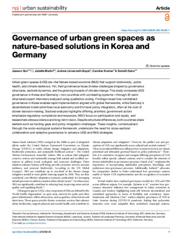 Son, J., Martin, J. ORCID: https://orcid.org/0000-0002-2862-8540, Linnerooth-Bayer, J., Kramer, C., & Saha, S. (2026). Governance of urban green spaces as nature-based solutions in Korea and Germany. npj Urban Sustainability 6 (1) e43. 10.1038/s42949-026-00340-1.