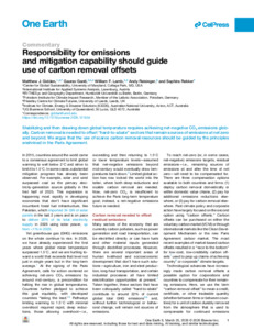 Gidden, M.J. ORCID: https://orcid.org/0000-0003-0687-414X, Ganti, G. ORCID: https://orcid.org/0000-0001-6638-4076, Lamb, W.F., Reisinger, A., & Rekker, S. (2026). Responsibility for emissions and mitigation capability should guide use of carbon removal offsets. One Earth 9 (3) e101654. 10.1016/j.oneear.2026.101654.