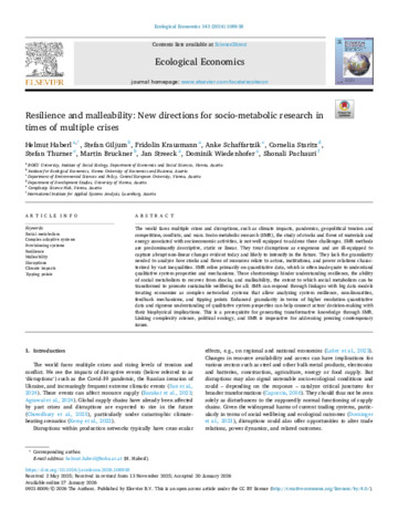Haberl, H., Giljum, S., Krausmann, F., Schaffartzik, A., Staritz, C., Thurner, S., Bruckner, M., Streeck, J., Wiedenhofer, D., & Pachauri, S. ORCID: https://orcid.org/0000-0001-8138-3178 (2026). Resilience and malleability: New directions for socio-metabolic research in times of multiple crises. Ecological Economics 243 e108938. 10.1016/j.ecolecon.2026.108938.