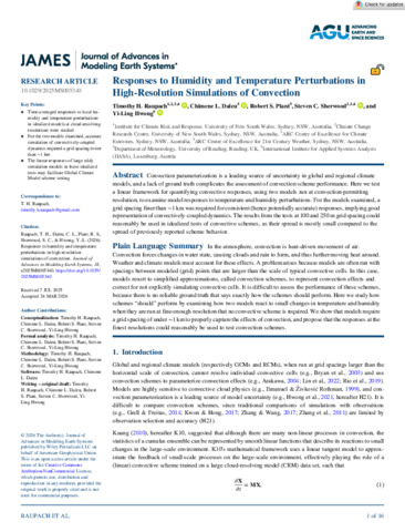 Raupach, T.H., Daleu, C.L., Plant, R.S., Sherwood, S.C., & Hwong, Y.-L. (2026). Responses to Humidity and Temperature Perturbations in High-Resolution Simulations of Convection. Journal of Advances in Modeling Earth Systems 18 (4) e2025MS005340. 10.1029/2025MS005340.