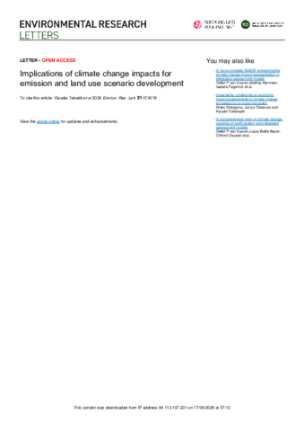 Tebaldi, C., O’Neill, B., Sheng, D., Prime, N., Zhao, M., Dorheim, K., & Brown, J. (2026). Implications of climate change impacts for emission and land use scenario development. Environmental Research Letters 21 (7) e074018. 10.1088/1748-9326/ae58be.